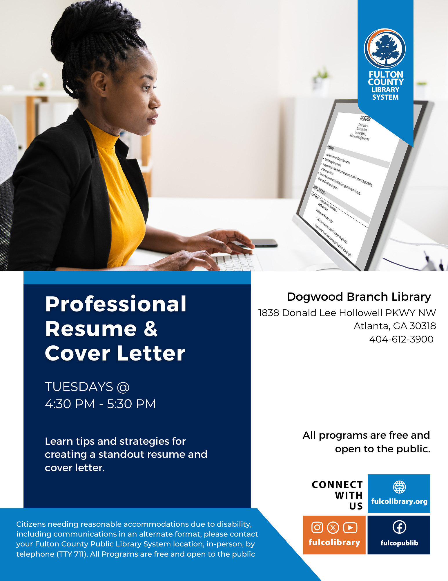 The Fulton County Library System hosts a Professional Resume and Cover Letter class on Tuesdays, from 4:30 PM to 5:30 PM, at the Dogwood Branch.